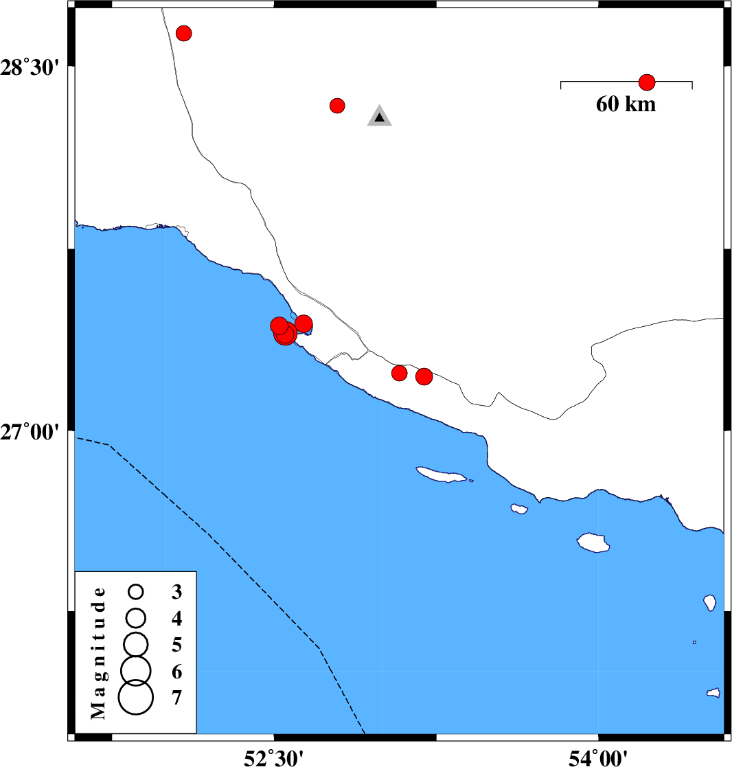 2025/07/26 | 10:10:02.4 | 13:40:02.4 | 27.403 | 52.552 | 12 | ML4.9 | Persian Gulf, 37 km South-West of Mehr | ||
