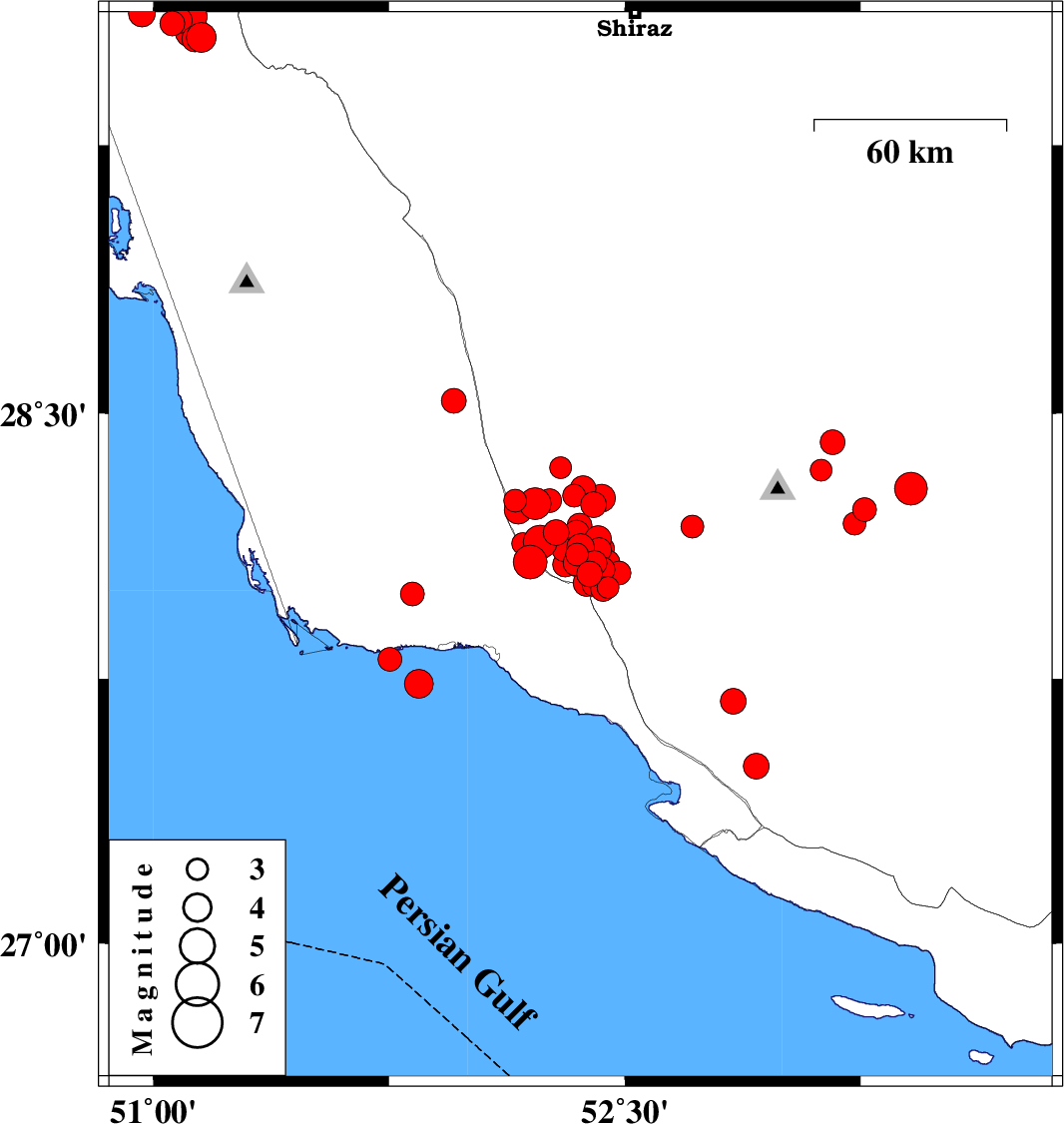 | 2025/01/17 | 00:10:11.6 | 03:40:11.6 | 29.597 | 51.083 | 12 | ML3.7 | Bushehr Province, 39 km North-West of Borazjan | ||