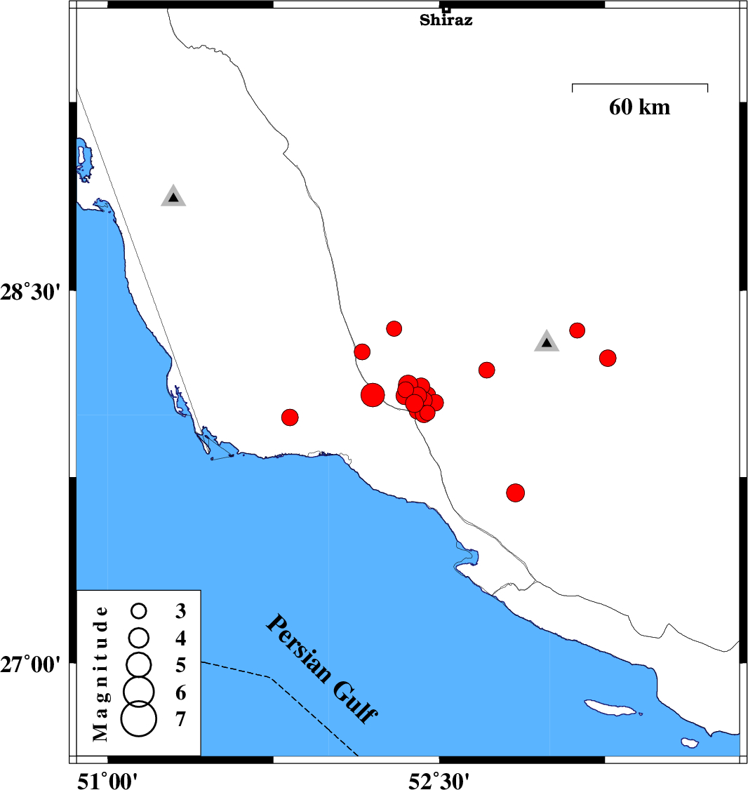 2025/01/30 12:51:05.7 16:21:05.7 28.0852.37912 ML4.4 Fars Province, 28 km North of Jam