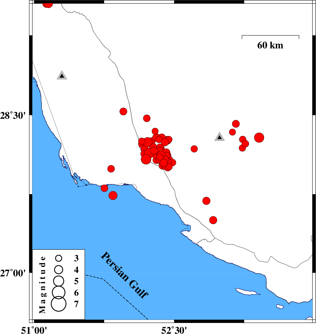 | 2025/01/04 | 21:42:37.2 | 01:12:37.2 | 27.737 | 51.845 | 37 | ML4.1 | Persian Gulf, 23 km -West of Bandar-e kangan | ||