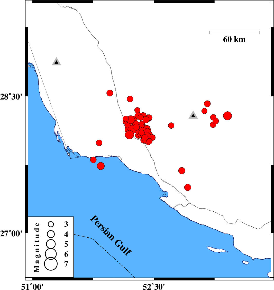 2025/01/07 13:08:29.8 16:38:29.8 28.17852.18512 ML3.6 Fars Province, 41 km North-East of Bandar-e kangan