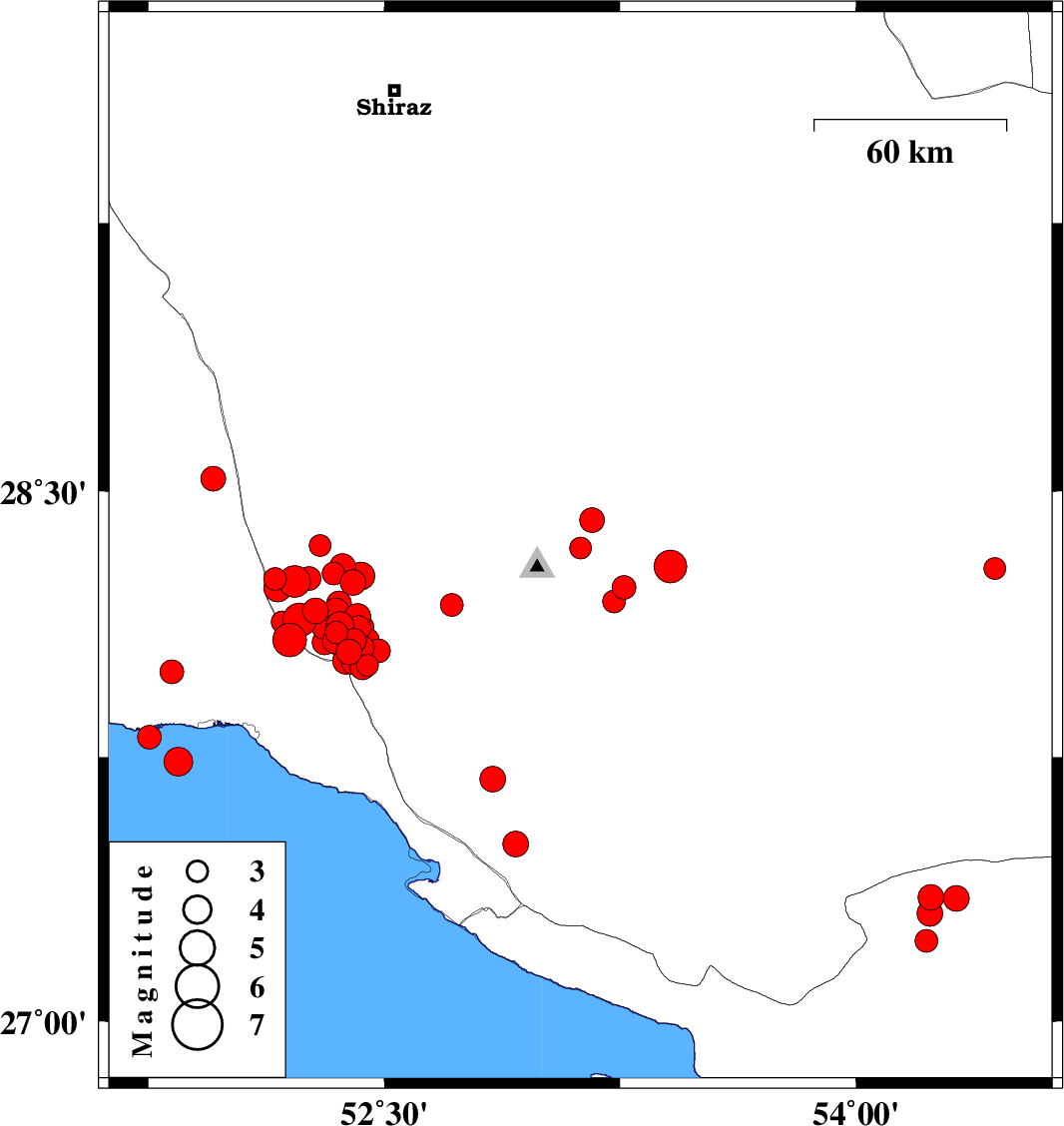 | 2025/01/30 | 11:08:06.8 | 14:38:06.8 | 28.079 | 52.445 | 8 | ML3.5 | Fars Province, 30 km North-East of Jam | ||