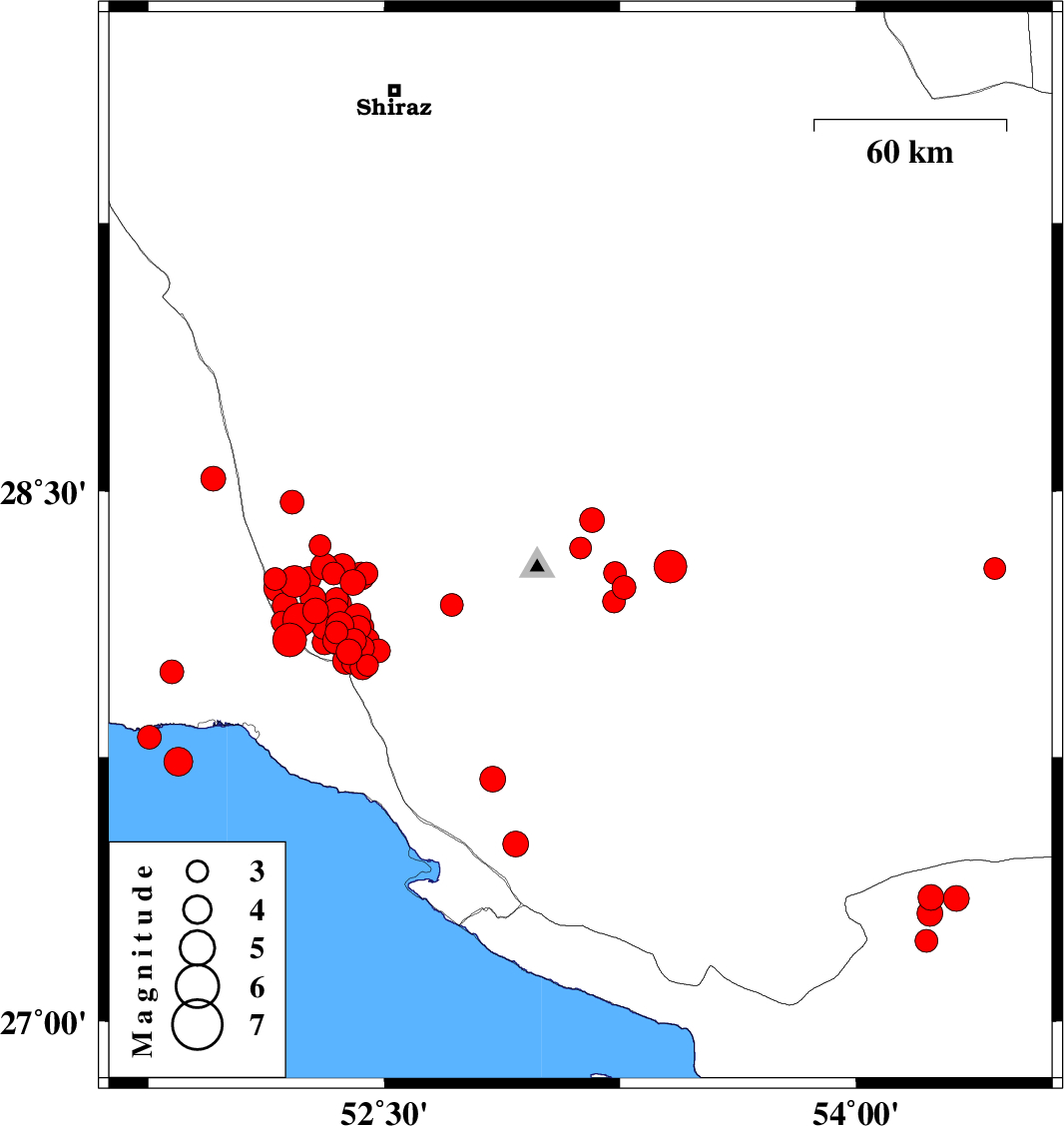 | 2025/01/25 | 02:39:11.6 | 06:09:11.6 | 27.687 | 52.845 | 10 | ML3.6 | Fars Province, 16 km North of Mehr | ||
