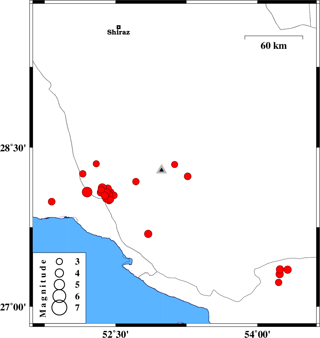 | 2025/01/30 | 11:08:06.8 | 14:38:06.8 | 28.079 | 52.445 | 8 | ML3.5 | Fars Province, 30 km North-East of Jam | ||