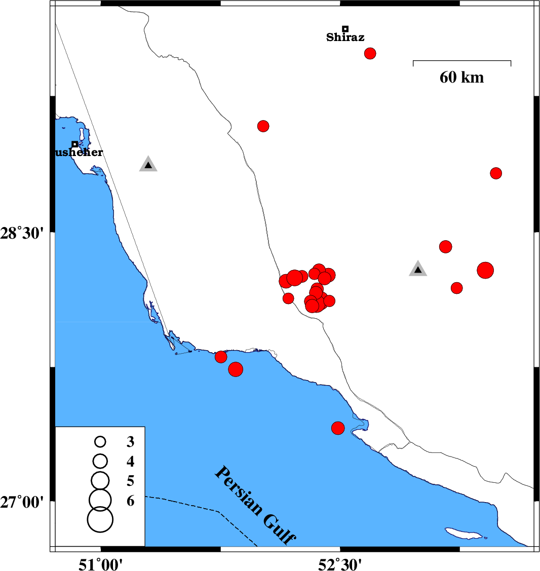 | 2025/01/06 | 17:23:49.1 | 20:53:49.1 | 28.287 | 53.41 | 10 | ML4.7 | Fars Province, 28 km South-West of Jahrom | ||