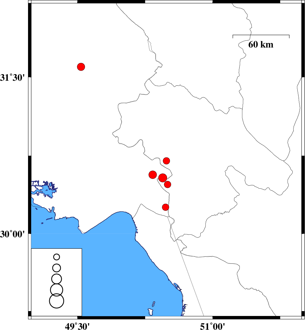 | 2024/12/20 | 13:45:20.3 | 17:15:20.3 | 31.598 | 49.539 | 17 | ML3.8 | Khoozestan Province, 36 km North of Ramhormoz |