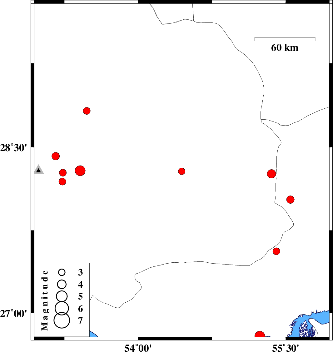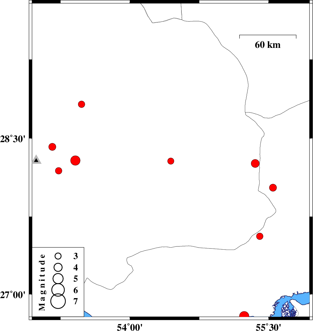 | 2025/01/06 | 19:38:55.6 | 23:08:55.6 | 28.189 | 53.23 | 12 | ML3.3 | Fars Province, 36 km South-East of Qir va Karzin | ||