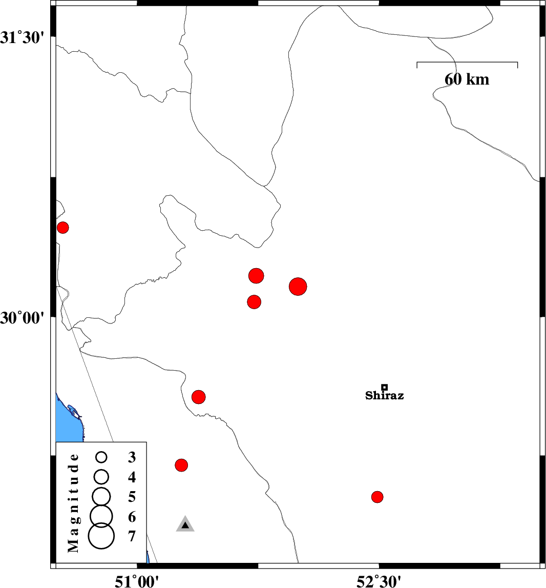 | 2025/10/07 | 07:53:09.4 | 11:23:09.4 | 29.566 | 51.38 | 17 | ML3.8 | Fars Province, 27 km -West of Kazerun | ||