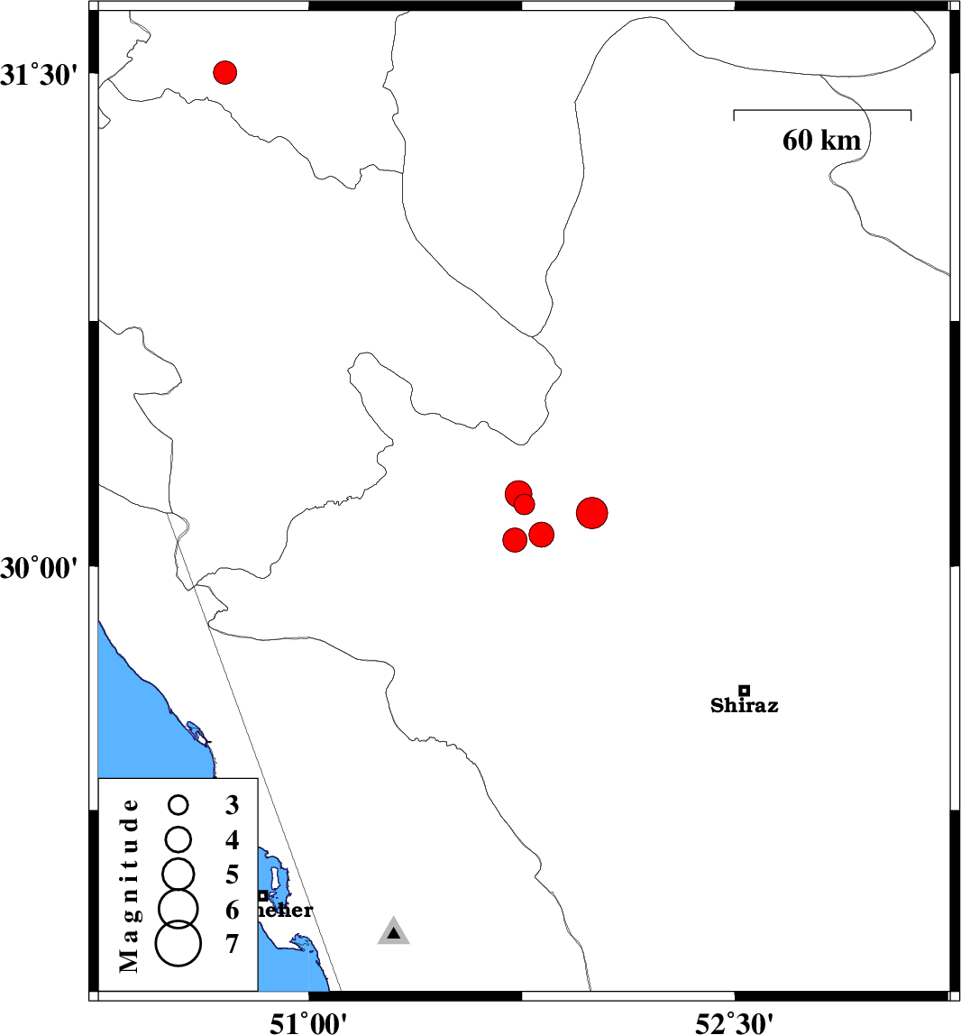 | 2025/10/19 | 03:12:05.8 | 06:42:05.8 | 30.08 | 51.725 | 12 | ML3.8 | Fars Province, 20 km -East of Nurabad |