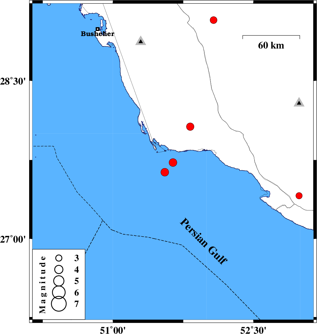 | 2025/11/14 | 19:33:51.4 | 23:03:51.4 | 27.634 | 51.554 | 12 | ML3.8 | Persian Gulf, 54 km South-West of Bandar-e kangan | ||