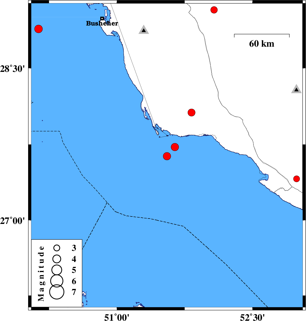 | 2025/11/10 | 12:22:09.6 | 15:52:09.6 | 28.884 | 50.133 | 12 | ML3.9 | Persian Gulf, 69 km South-West of Busheher | ||