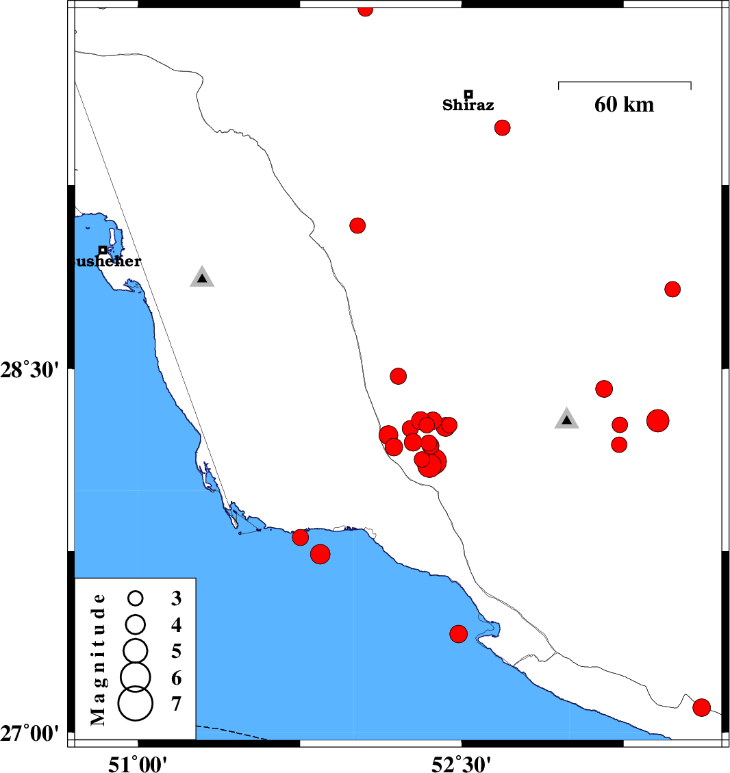 | 2025/01/07 | 13:33:41.1 | 17:03:41.1 | 28.27 | 53.234 | 12 | ML3.3 | Fars Province, 29 km South-East of Qir va Karzin | ||