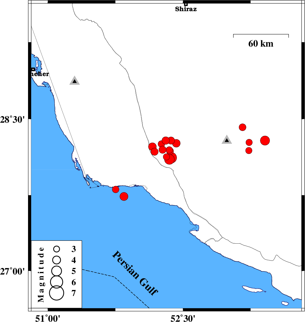2025/01/07 13:08:29.8 16:38:29.8 28.17852.18512 ML3.6 Fars Province, 41 km North-East of Bandar-e kangan
