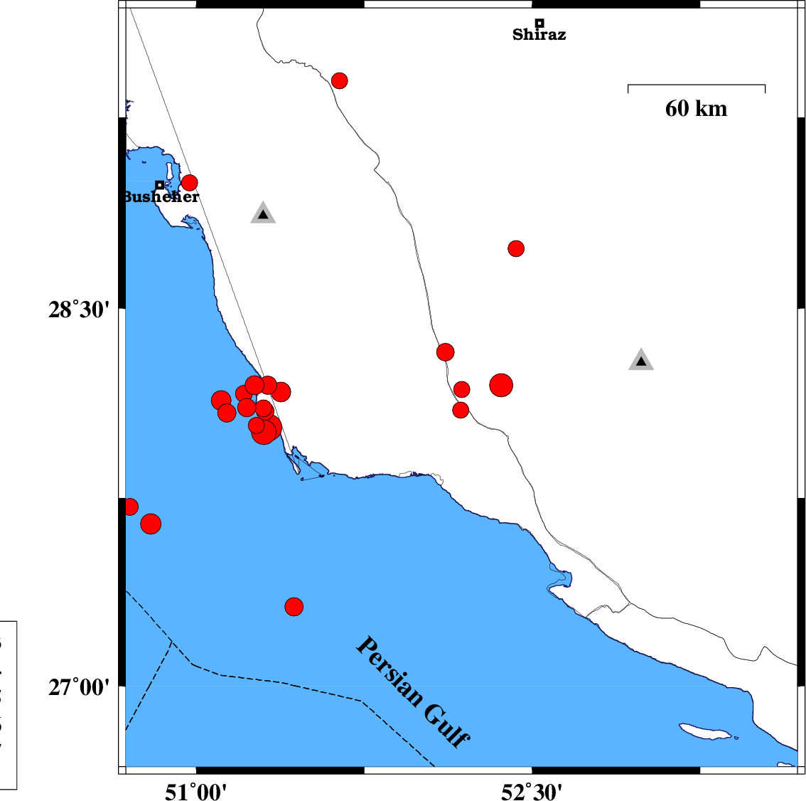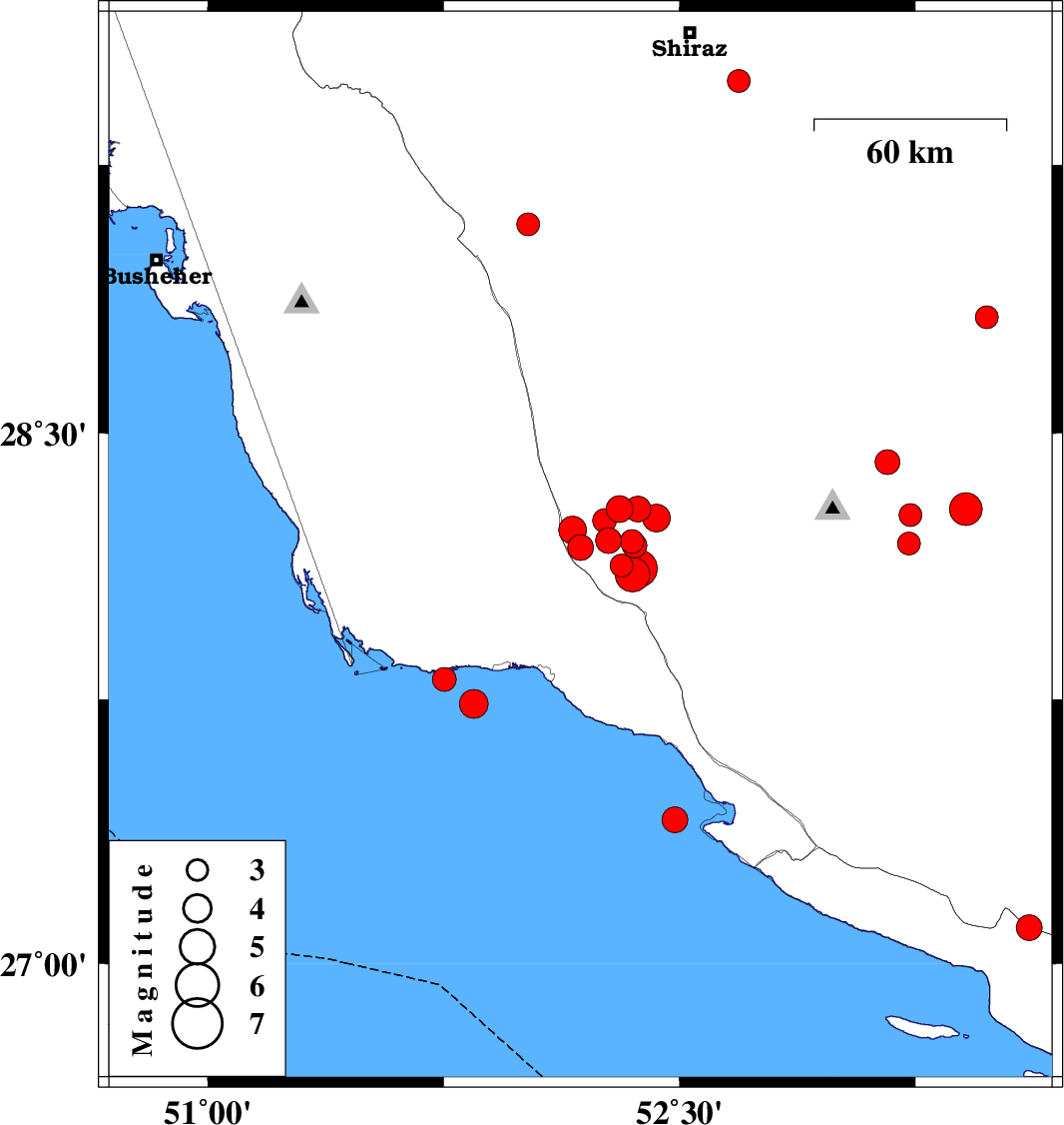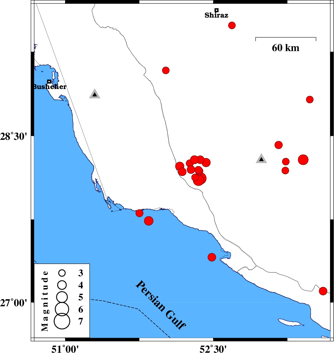 2025/01/07 13:08:29.8 16:38:29.8 28.17852.18512 ML3.6 Fars Province, 41 km North-East of Bandar-e kangan