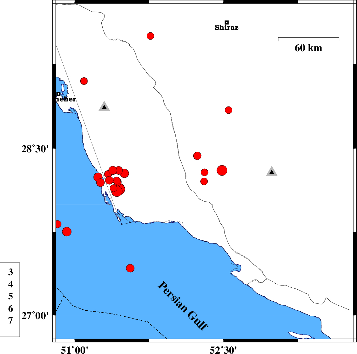 2025/01/07 13:08:29.8 16:38:29.8 28.17852.18512 ML3.6 Fars Province, 41 km North-East of Bandar-e kangan