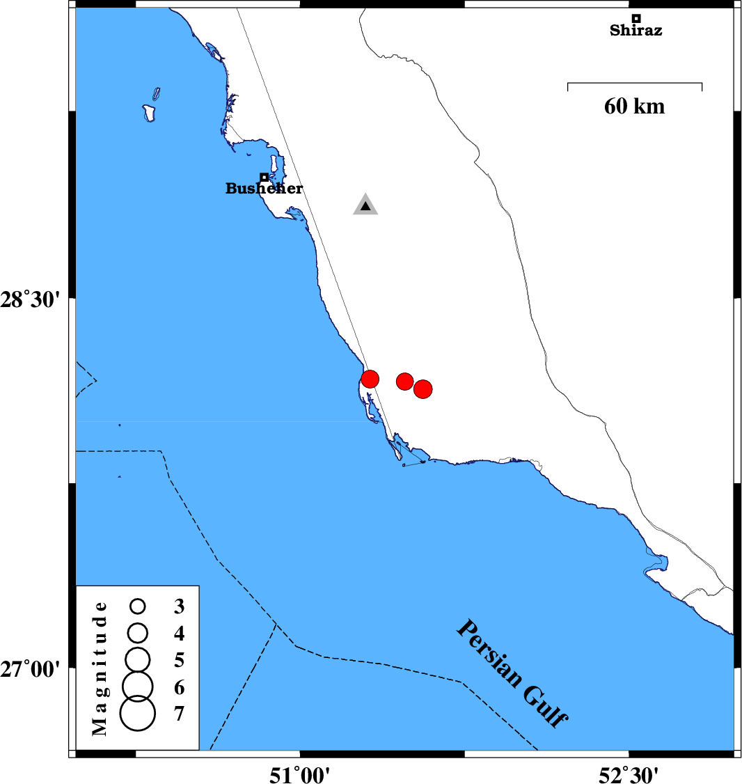 | 2025/12/01 | 19:57:09.0 | 23:27:09.0 | 28.132 | 51.559 | 22 | ML3.8 | Bushehr Province, 61 km South-East of Khormog | ||
