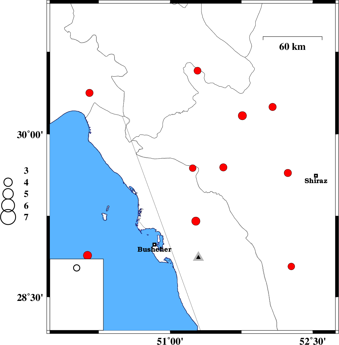 | 2025/11/10 | 12:22:09.6 | 15:52:09.6 | 28.884 | 50.133 | 12 | ML3.9 | Persian Gulf, 69 km South-West of Busheher | ||