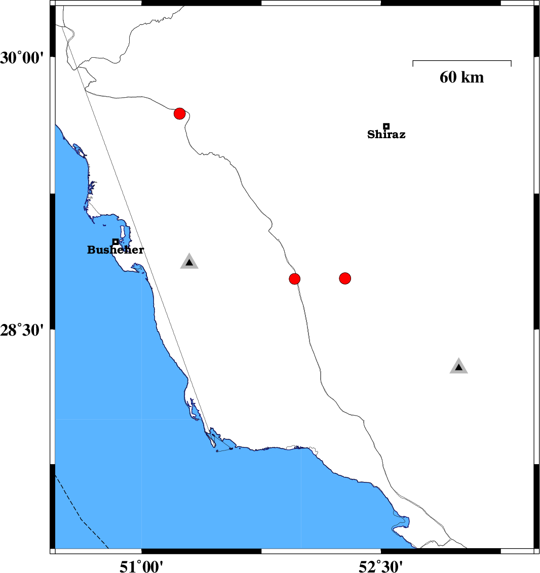 | 2025/12/10 | 12:58:12.2 | 16:28:12.2 | 29.689 | 51.237 | 12 | ML3.2 | Bushehr Province, 48 km North of Borazjan | ||