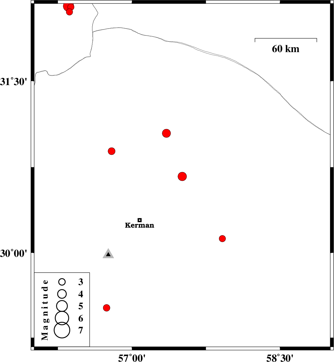 | 2025/11/25 | 10:35:09.9 | 14:05:09.9 | 29.514 | 56.743 | 12 | ML3.1 | Kerman Province, 34 km North-East of Baft |