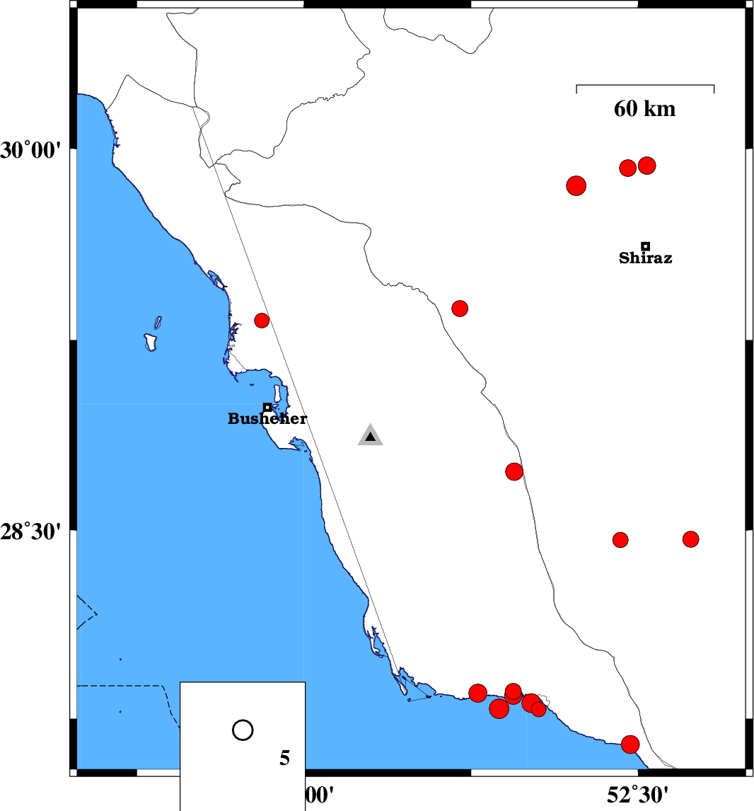 | 2025/12/03 | 00:20:25.4 | 03:50:25.4 | 28.178 | 51.477 | 12 | ML3.3 | Bushehr Province, 54 km South-East of Khormog | ||