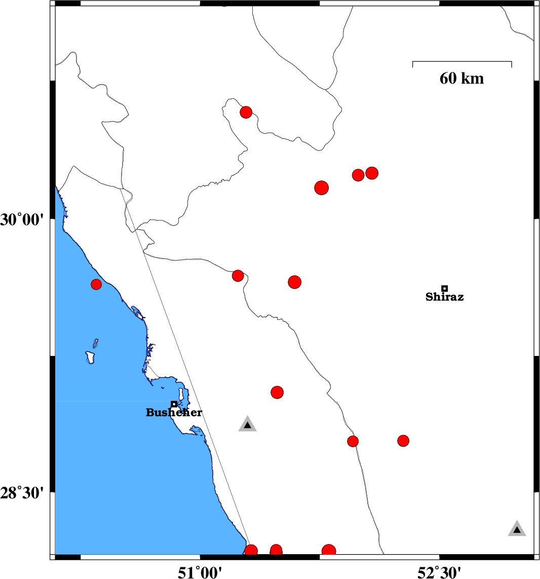 | 2025/12/10 | 12:58:12.2 | 16:28:12.2 | 29.689 | 51.237 | 12 | ML3.2 | Bushehr Province, 48 km North of Borazjan | ||