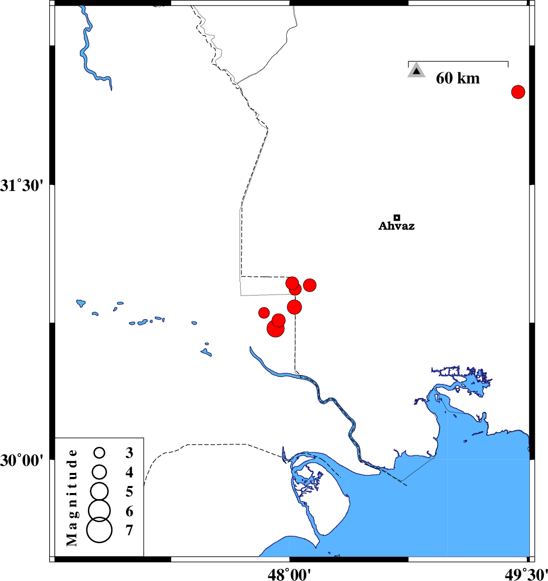 | 2026/01/12 | 08:50:01.9 | 12:20:01.9 | 30.933 | 48.034 | 12 | ML3.5 | Khoozestan Province, 51 km North-East of Al Basrah | ||