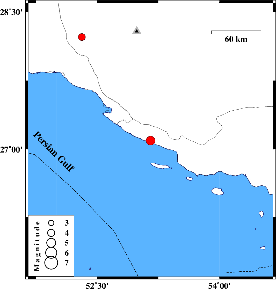 | 2026/01/20 | 03:46:00.9 | 07:16:00.9 | 28.224 | 52.314 | 12 | ML3.9 | Fars Province, 43 km North of Jam |