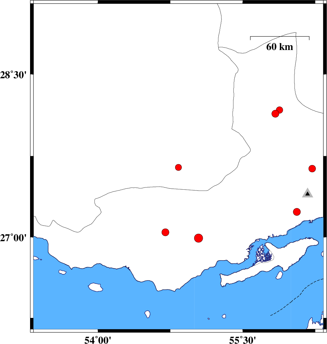 | 2026/01/23 | 17:20:22.1 | 20:50:22.1 | 27.046 | 54.7 | 12 | ML3.4 | Hormozgan Province, 37 km South-East of Bastak | ||