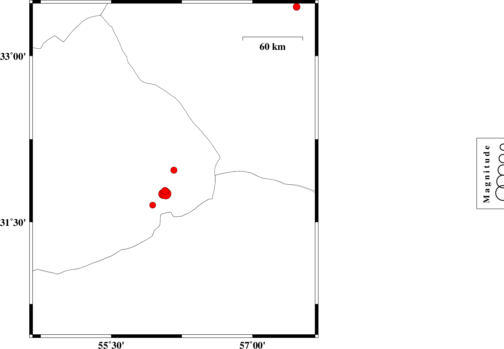 | 2026/01/15 | 22:51:56.6 | 02:21:56.6 | 33.437 | 57.468 | 12 | ML3.4 | Yazd Province, 53 km South-East of Tabas | ||