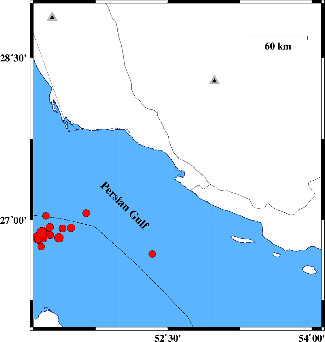 | 2026/02/01 | 05:11:18.2 | 08:41:18.2 | 27.296 | 52.526 | 12 | ML5.5 | Persian Gulf, 45 km South-West of Mehr |