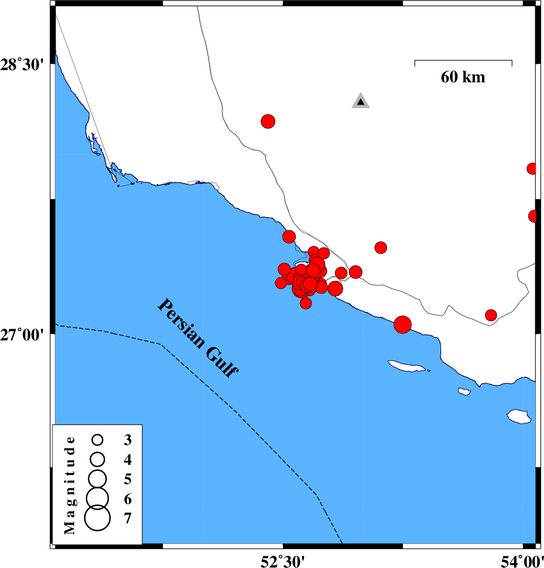 | 2026/02/19 | 03:43:06.5 | 07:13:06.5 | 27.32 | 52.578 | 12 | ML4 | Persian Gulf, 40 km South-West of Mehr | ||