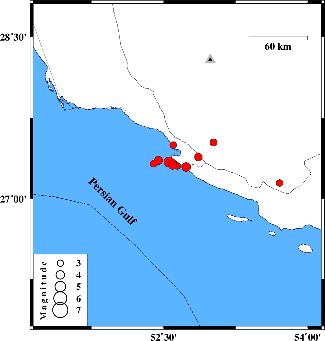 | 2026/02/04 | 06:22:39.3 | 09:52:39.3 | 27.387 | 52.862 | 12 | ML3.6 | Bushehr Province, 18 km South of Mehr |