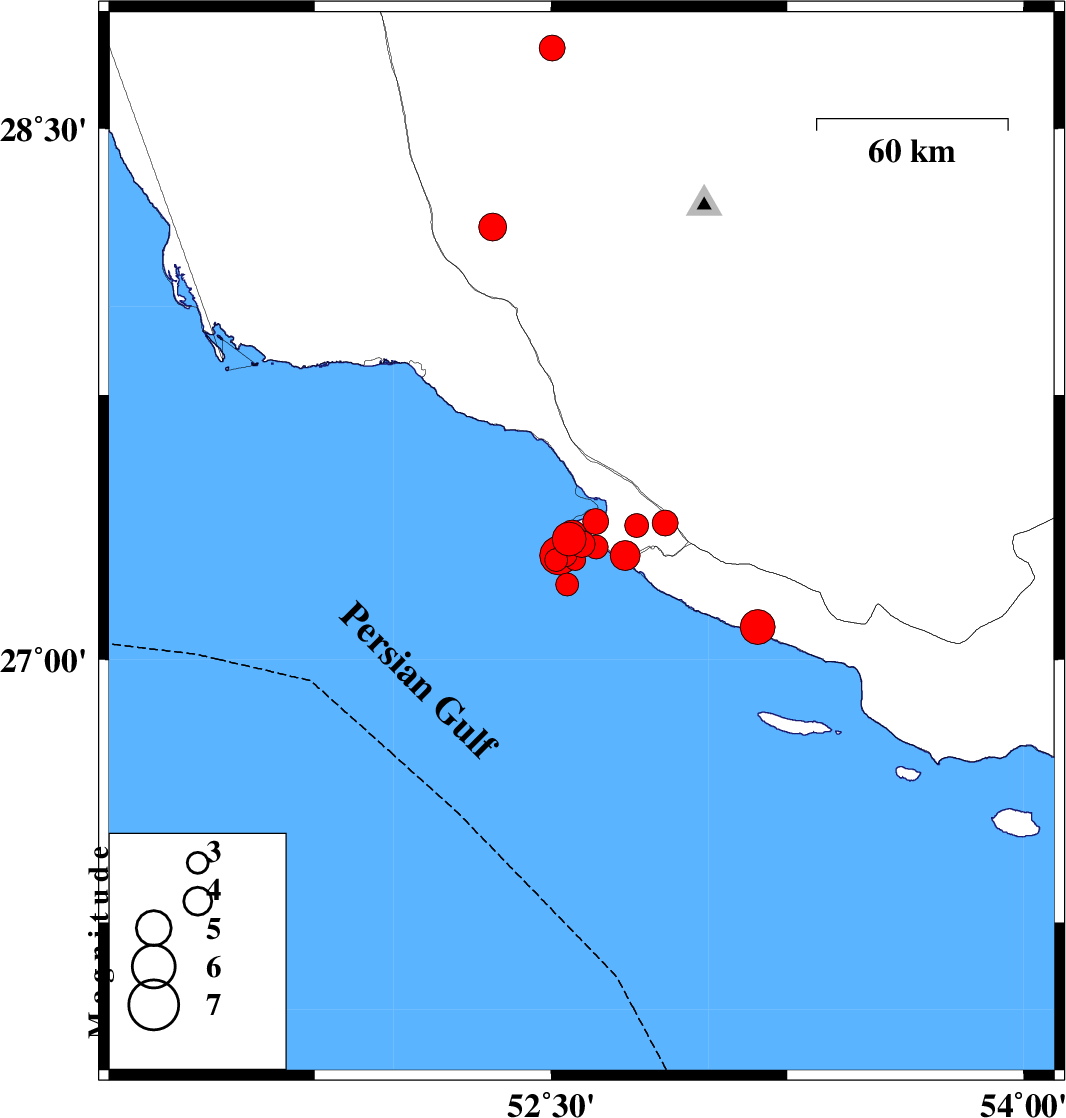 | 2026/02/04 | 06:22:39.3 | 09:52:39.3 | 27.387 | 52.862 | 12 | ML3.6 | Bushehr Province, 18 km South of Mehr | ||