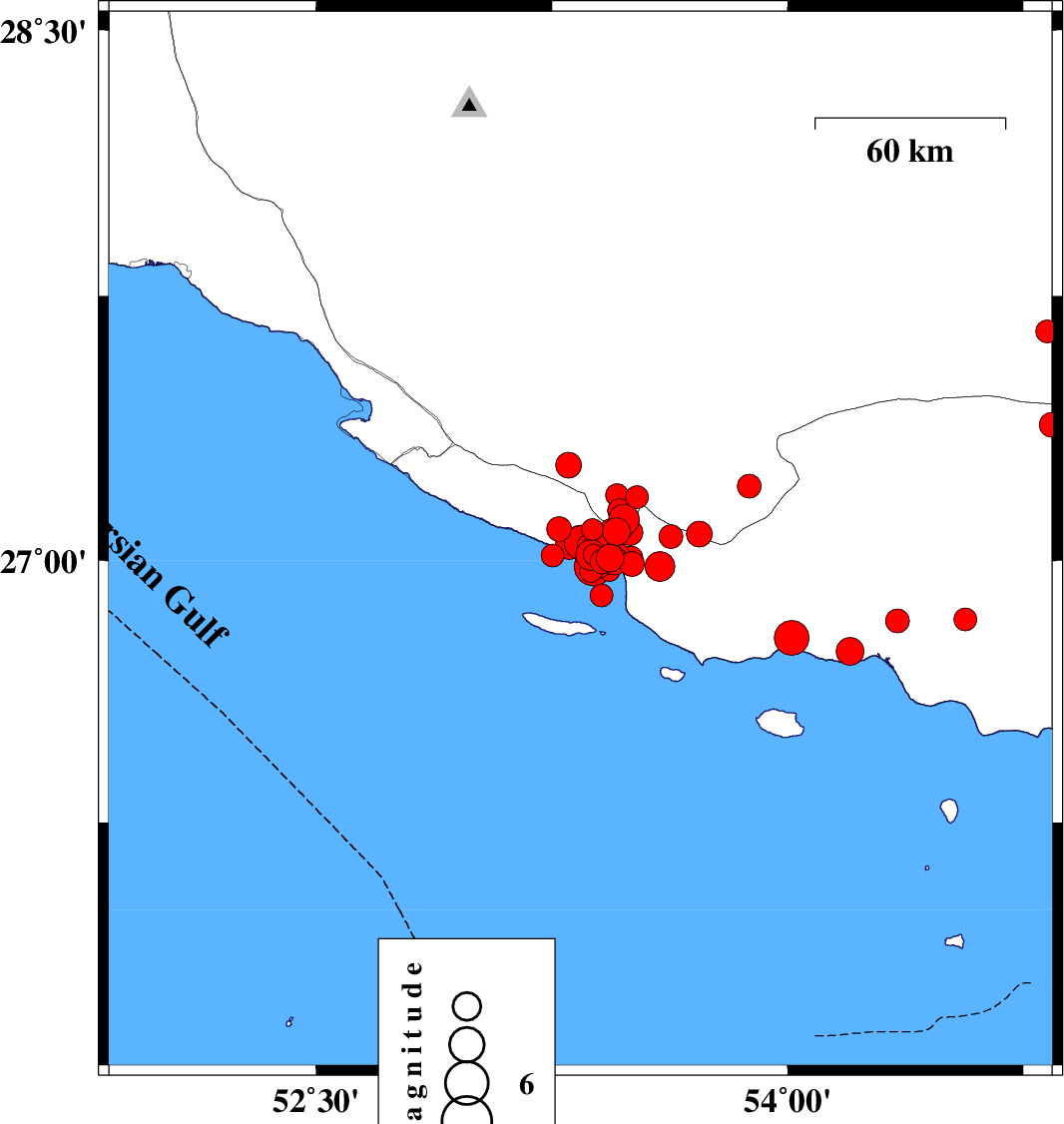| 2026/02/19 | 03:43:06.5 | 07:13:06.5 | 27.32 | 52.578 | 12 | ML4 | Persian Gulf, 40 km South-West of Mehr | ||