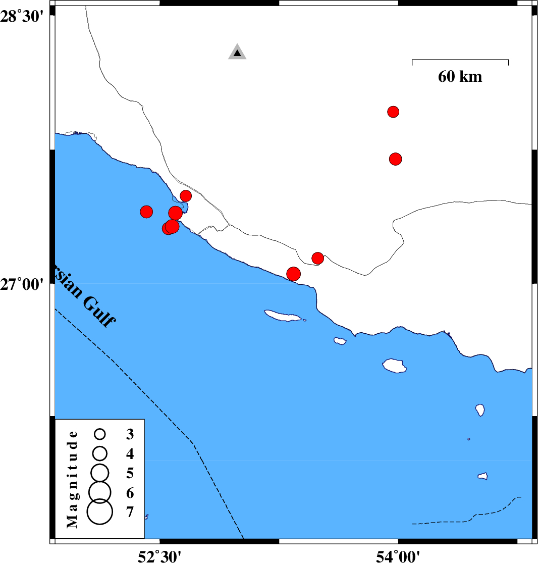 | 2026/02/19 | 03:43:06.5 | 07:13:06.5 | 27.32 | 52.578 | 12 | ML4 | Persian Gulf, 40 km South-West of Mehr | ||