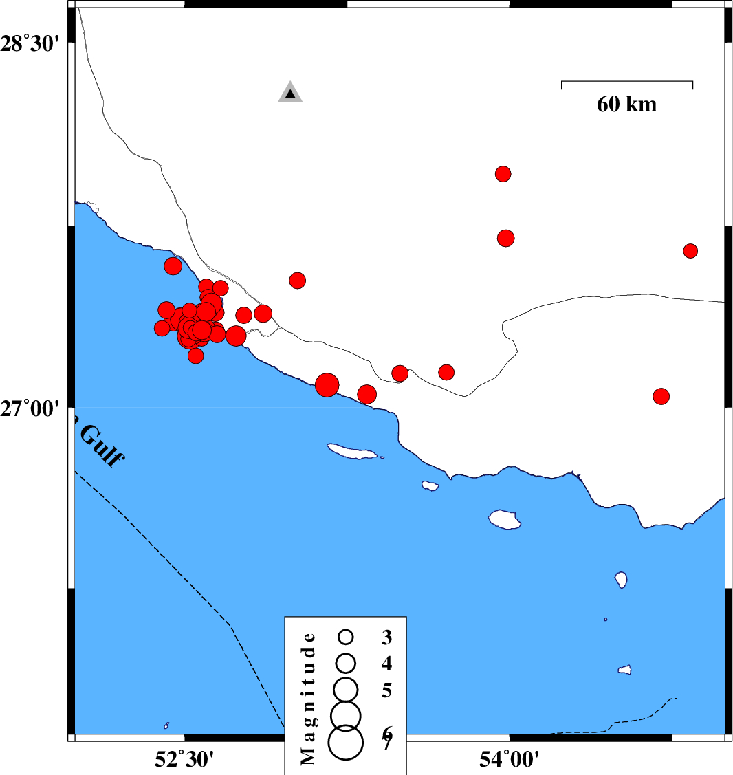 | 2026/02/19 | 03:43:06.5 | 07:13:06.5 | 27.32 | 52.578 | 12 | ML4 | Persian Gulf, 40 km South-West of Mehr | ||