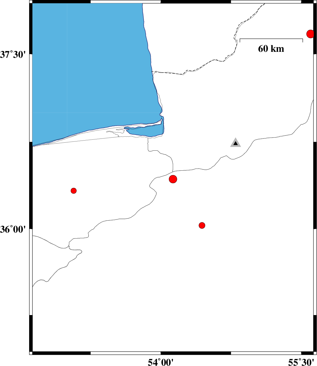 | 2006/11/13 | 15:00:27.4 | 18:30:27.4 | 36.43 | 54.13 | 14 | ML3.8 | 34 km North-West of Damghan, Semnan Province | ||