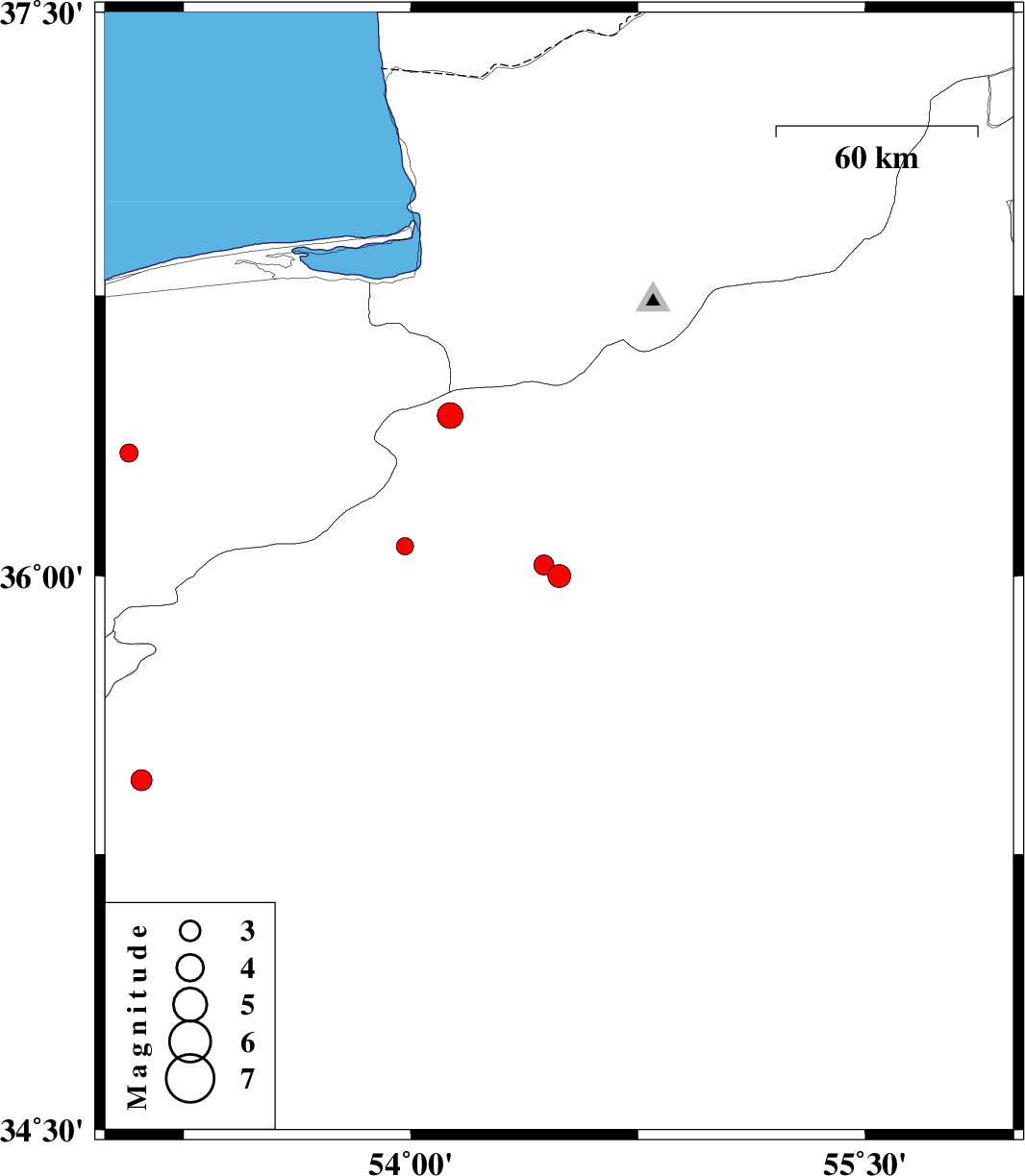 | 2006/11/13 | 15:00:27.4 | 18:30:27.4 | 36.43 | 54.13 | 14 | ML3.8 | 34 km North-West of Damghan, Semnan Province | ||