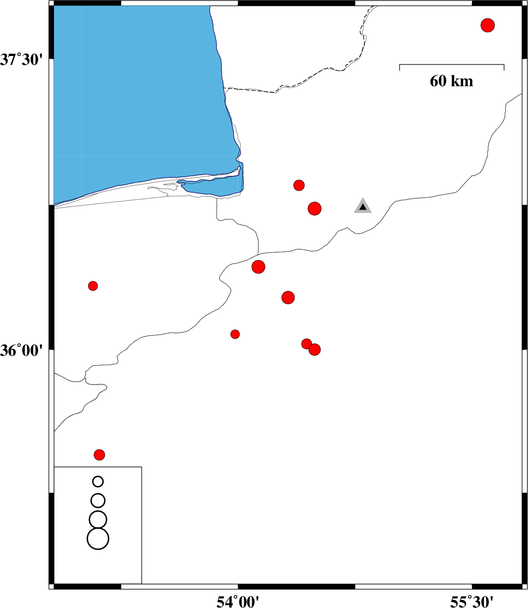 | 2006/11/02 | 00:58:01.5 | 04:28:01.5 | 36.73 | 54.49 | 16 | ML3.8 | 12 km South of Gorgan, Golestan Province | ||