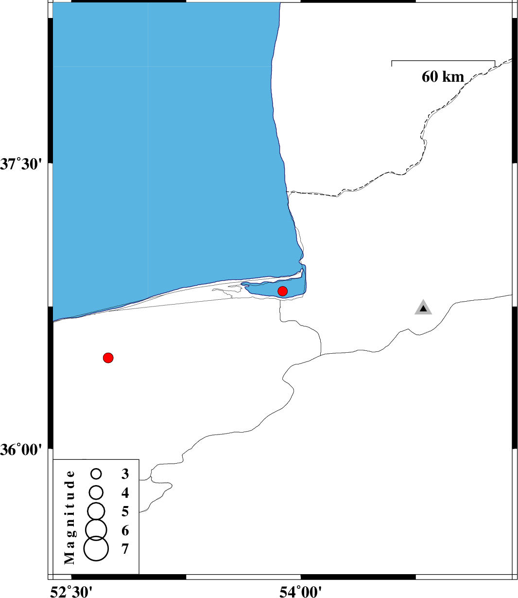 | 2007/02/22 | 08:50:43.4 | 12:20:43.4 | 36.83 | 53.88 | 14 | ML2.8 | Caspian Sea, 9 km Bandar-e gaz | ||