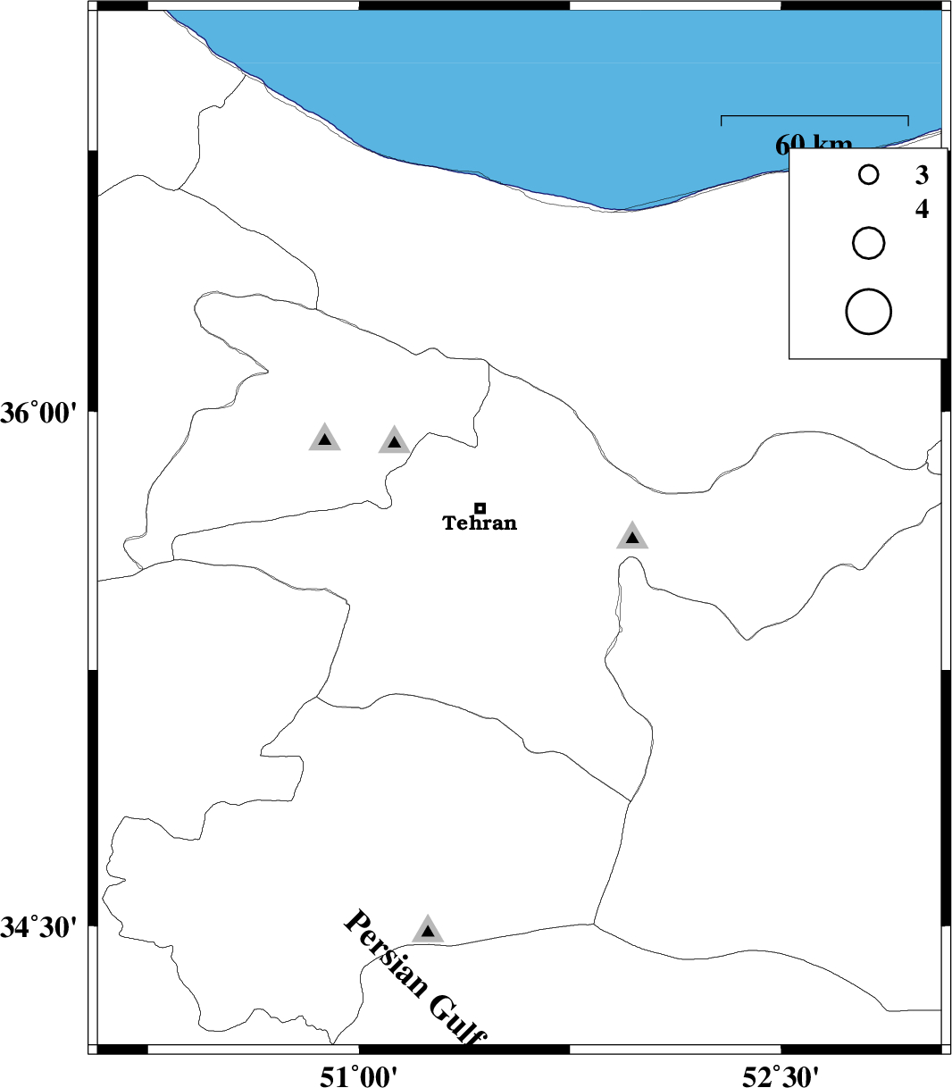 | 2007/02/26 | 19:43:06.0 | 23:13:06.0 | 35.71 | 52.05 | 14 | ML3.4 | 2 km Damavand, Tehran Province |
