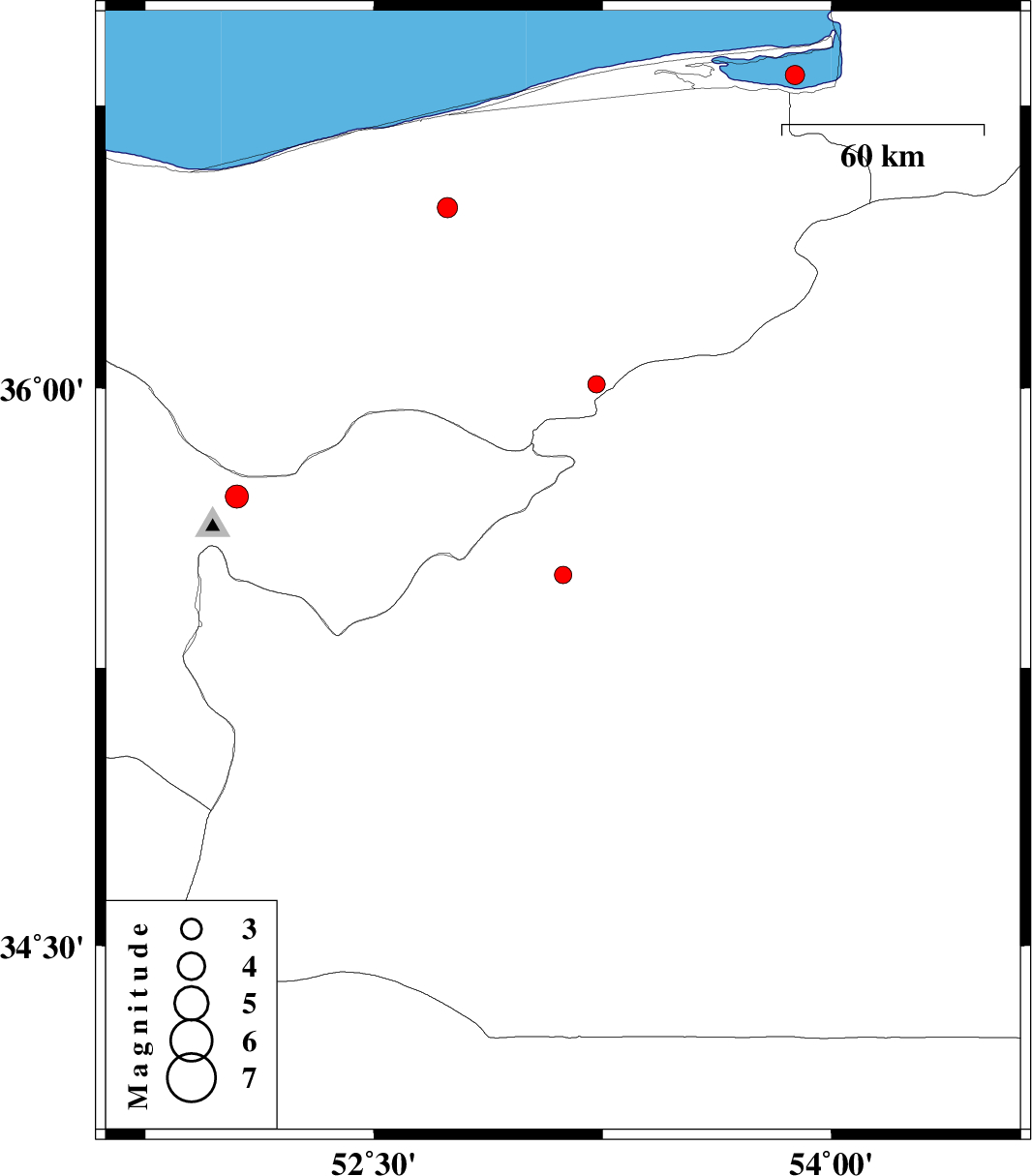 | 2007/02/22 | 08:50:43.4 | 12:20:43.4 | 36.83 | 53.88 | 14 | ML2.8 | Caspian Sea, 9 km Bandar-e gaz | ||