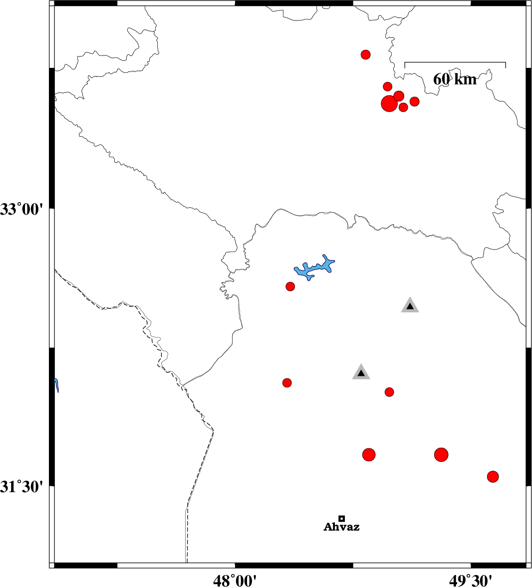 | 2007/03/28 | 18:26:12.2 | 21:56:12.2 | 32.58 | 48.35 | 17 | ML2.5 | 13 km North of Andimeshk, Khoozestan Province | ||