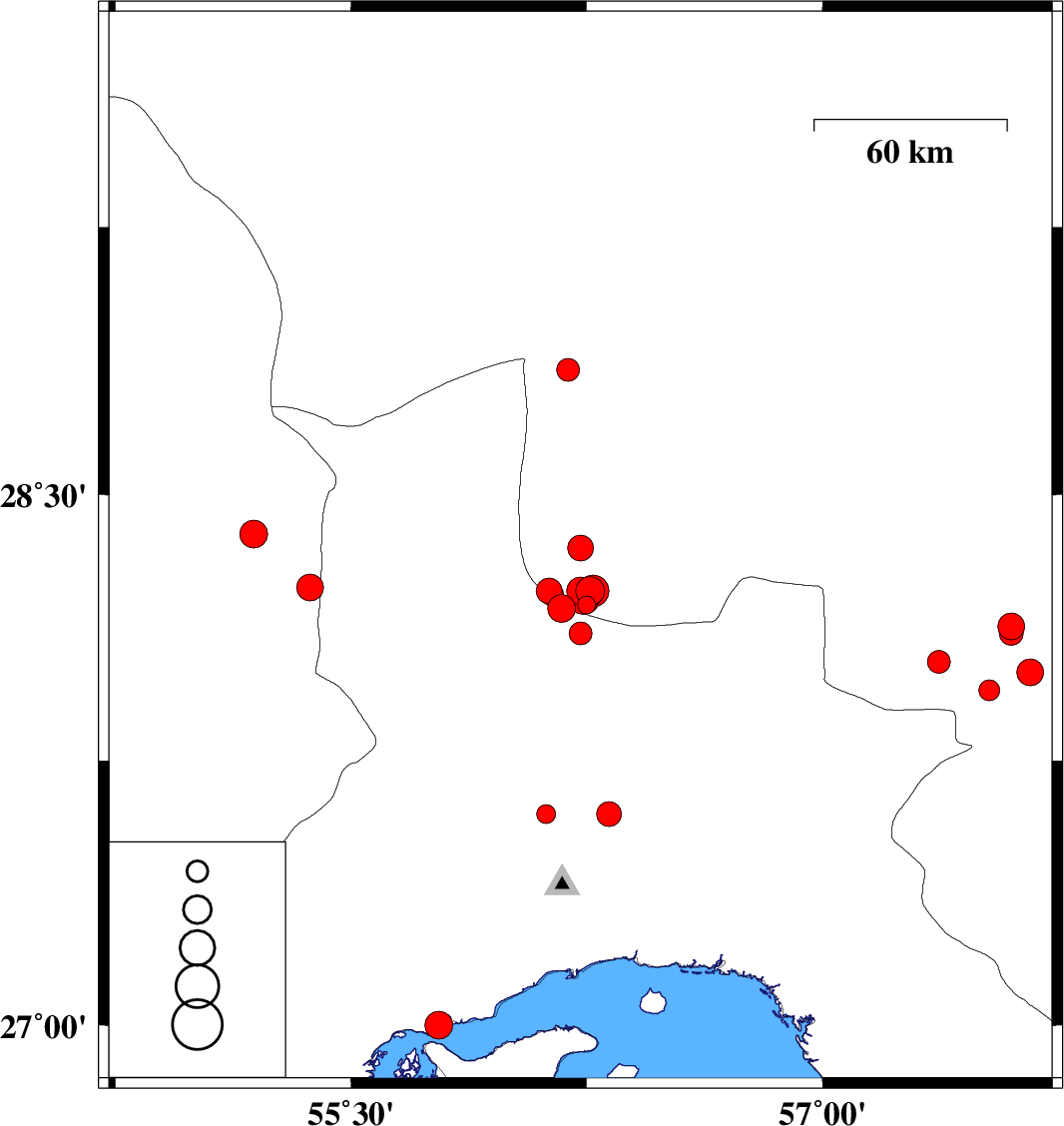 | 2007/04/18 | 15:45:27.8 | 19:15:27.8 | 27.6 | 56.12 | 15 | ML2.7 | 49 km North-West of Bandar-e abbas, Hormozgan Province | ||