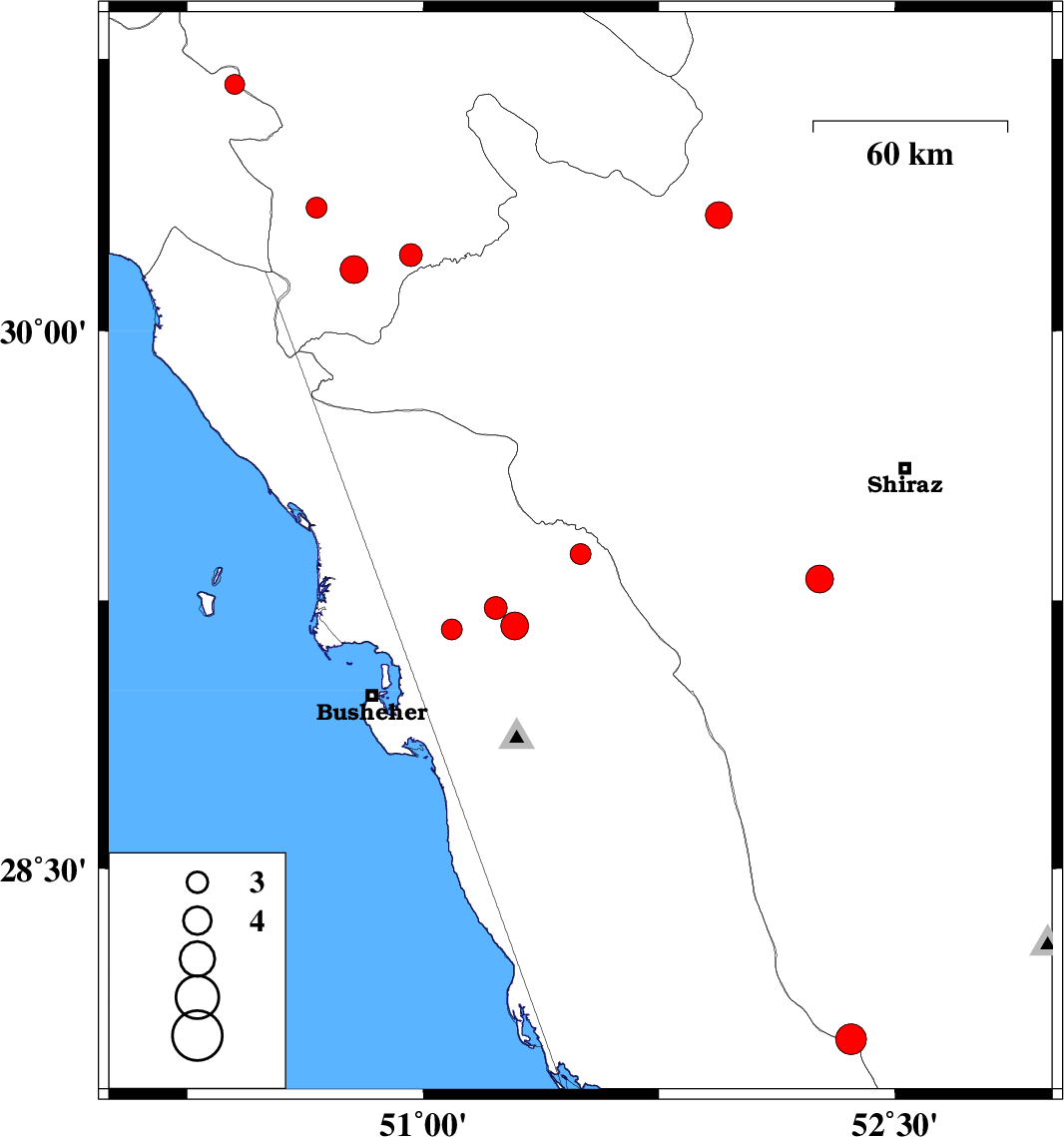 | 2007/05/29 | 06:18:57.2 | 09:48:57.2 | 29.31 | 52.26 | 46 | ML4 | 43 km South-West of Shiraz, Fars Province | ||