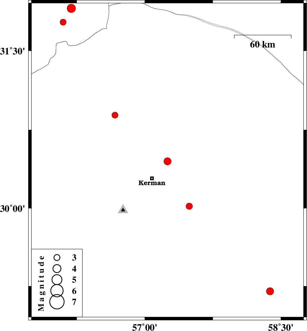 | 2007/05/27 | 20:44:17.1 | 00:14:17.1 | 30.02 | 57.49 | 16 | ML3.3 | 49 km South-East of Kerman, Kerman Province | ||