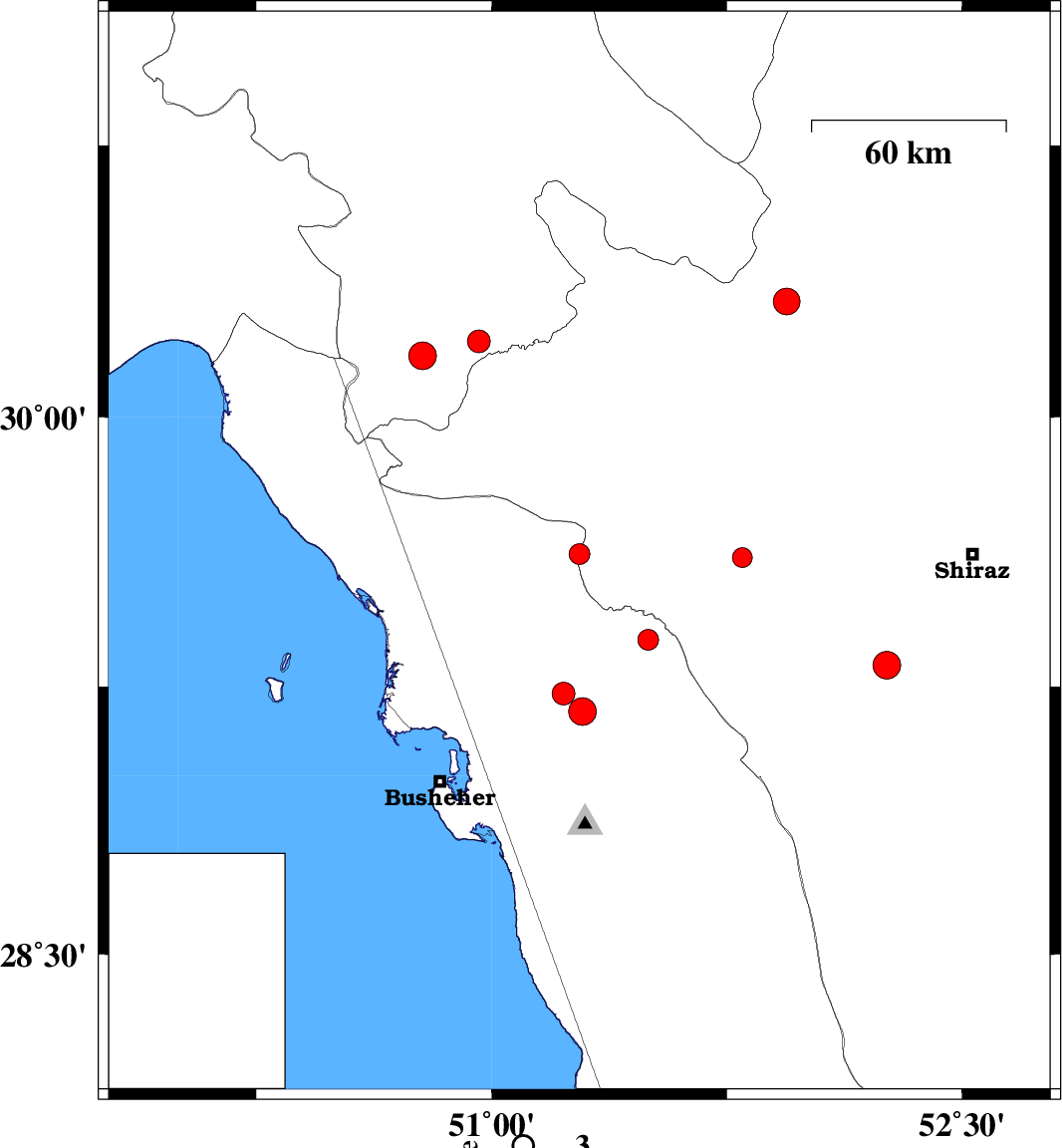 | 2007/05/29 | 06:18:57.2 | 09:48:57.2 | 29.31 | 52.26 | 46 | ML4 | 43 km South-West of Shiraz, Fars Province | ||