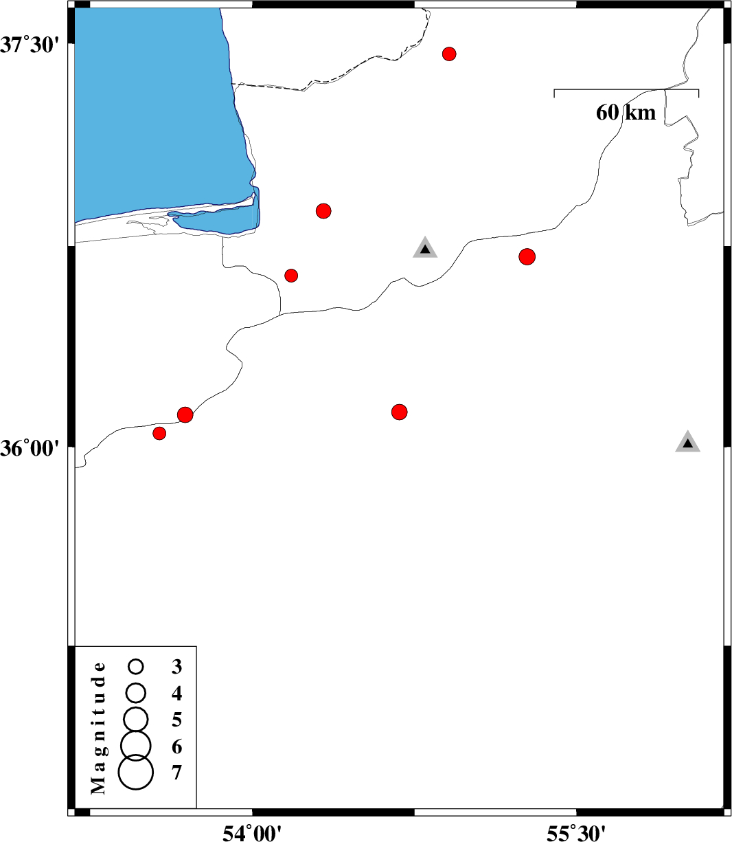 | 2007/05/18 | 09:29:59.8 | 12:59:59.8 | 36.88 | 54.33 | 14 | ML3.1 | 10 km West of Gorgan, Golestan Province |