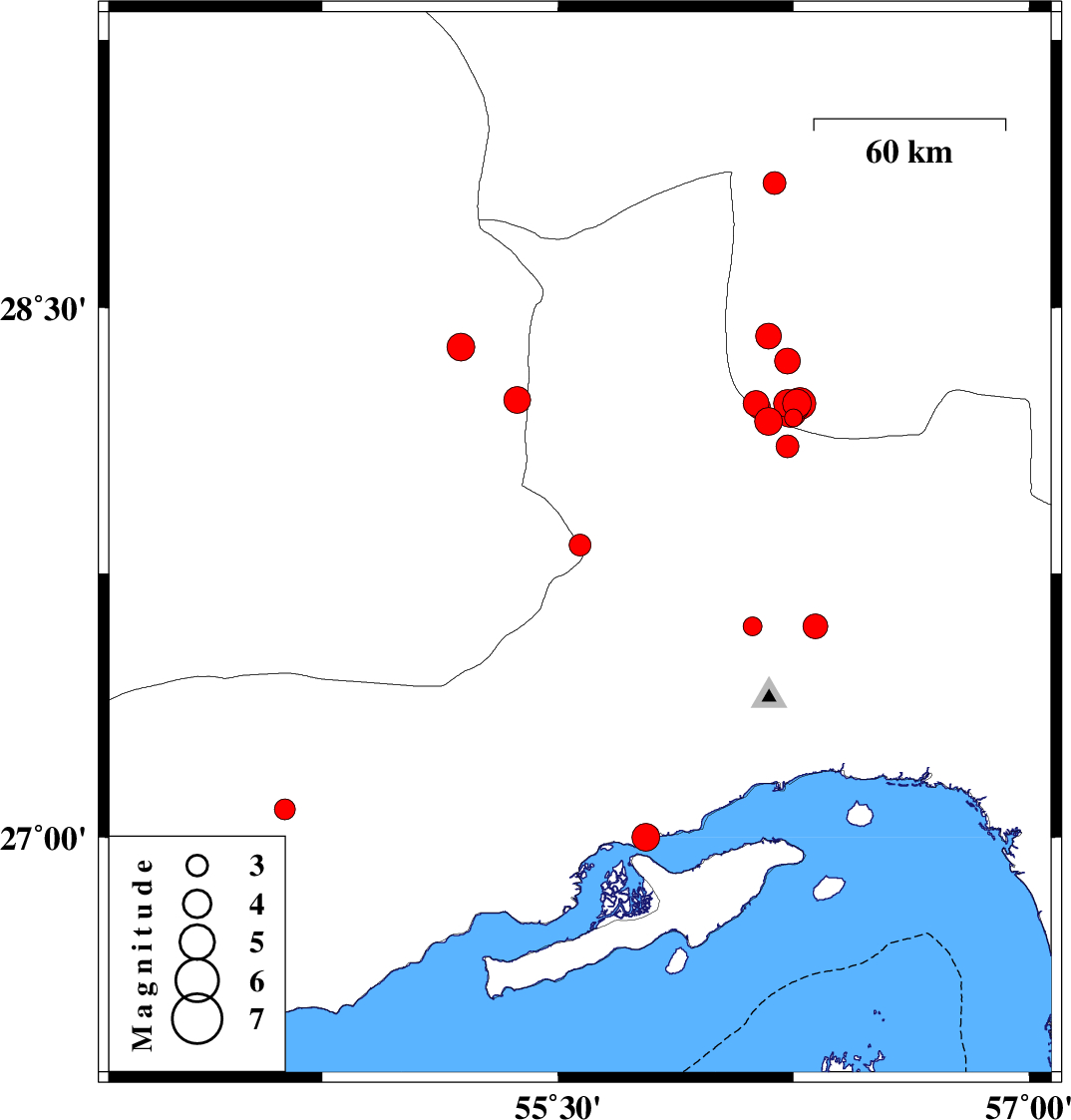 | 2007/04/18 | 15:45:27.8 | 19:15:27.8 | 27.6 | 56.12 | 15 | ML2.7 | 49 km North-West of Bandar-e abbas, Hormozgan Province |