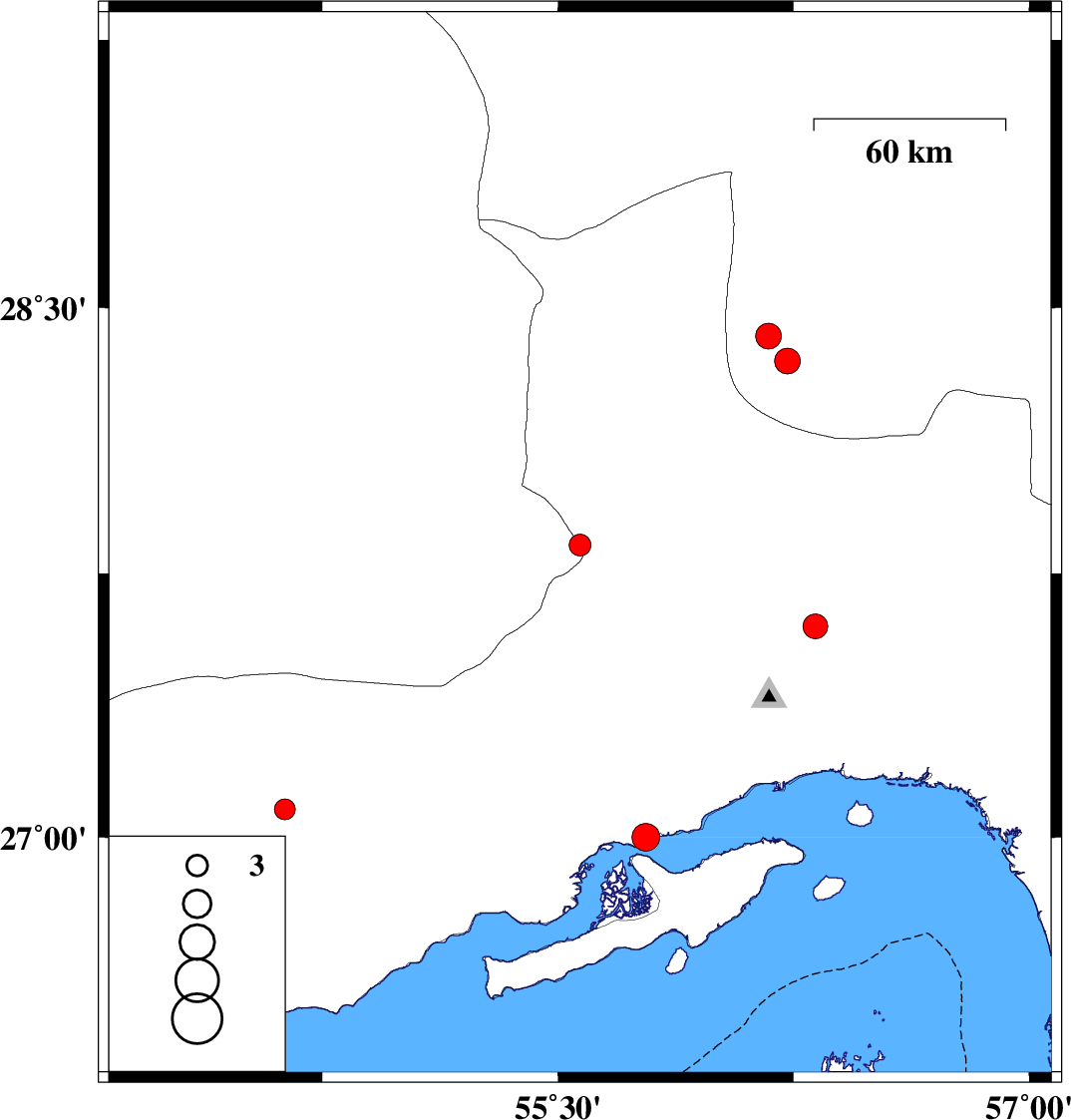 | 2007/05/01 | 07:51:27.6 | 11:21:27.6 | 27 | 55.78 | 2 | ML3.9 | Persian Gulf, 48 km West of Qeshm |